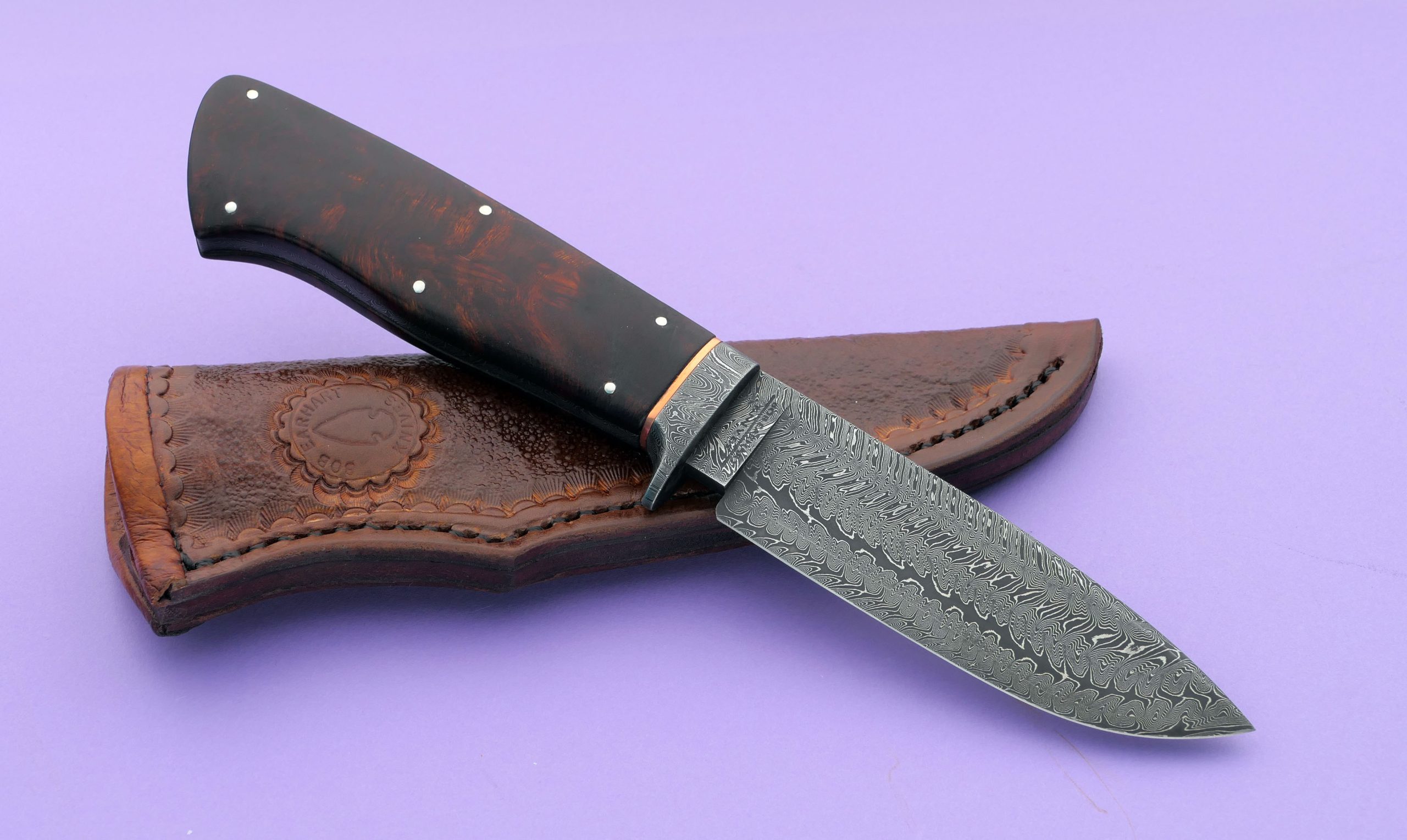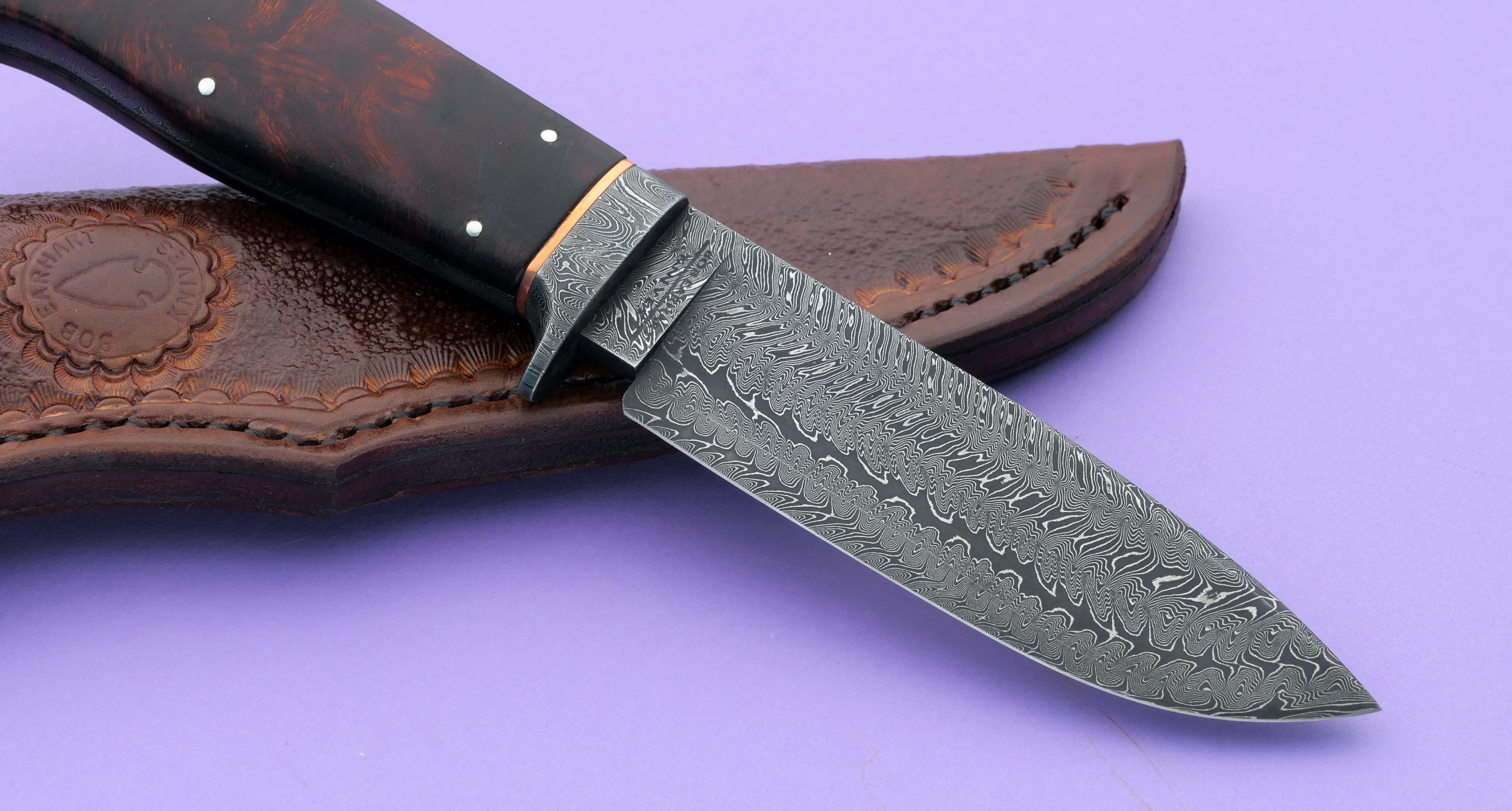 Comment: This knife features a frame handle. The Damascus frame has scales added. An exceptional aspect of this knife is that the Turkish Twist appears as if the ends have been cut giving this Damascus the look of stars and concentric circles. The blade tang is inserted through the guard and into the frame. A more complex way to build a knife is to have the guard and frame fit together precisely. Also, this knife features the “Museum Fit.” The handle material is just slightly above the tang. Difficult to do because of the precision required to keep the handle material at an equal distance above the tang around the entire handle. All in all, a stunning knife both in construction and visual appeal. Bob is an ABS Journeyman Smith.