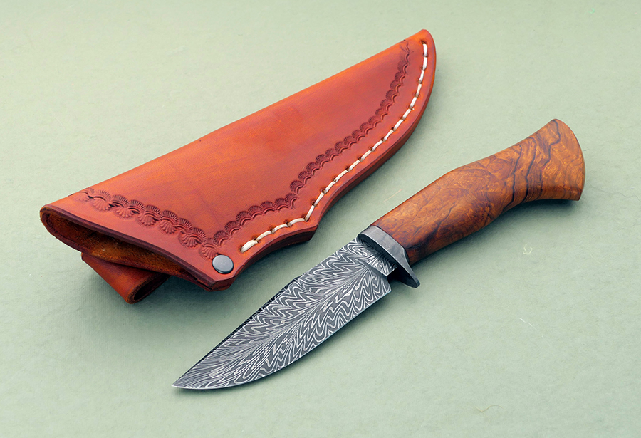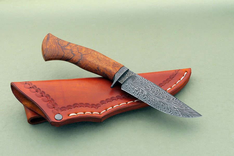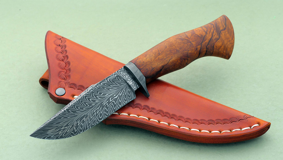 Comments: Beautiful execution of the classic hunting knife style with a stunning Mosaic Feather Pattern Damascus. Lightweight, excellent balance, and handle ergonomics. Dan is an ABS Journeyman Smith.