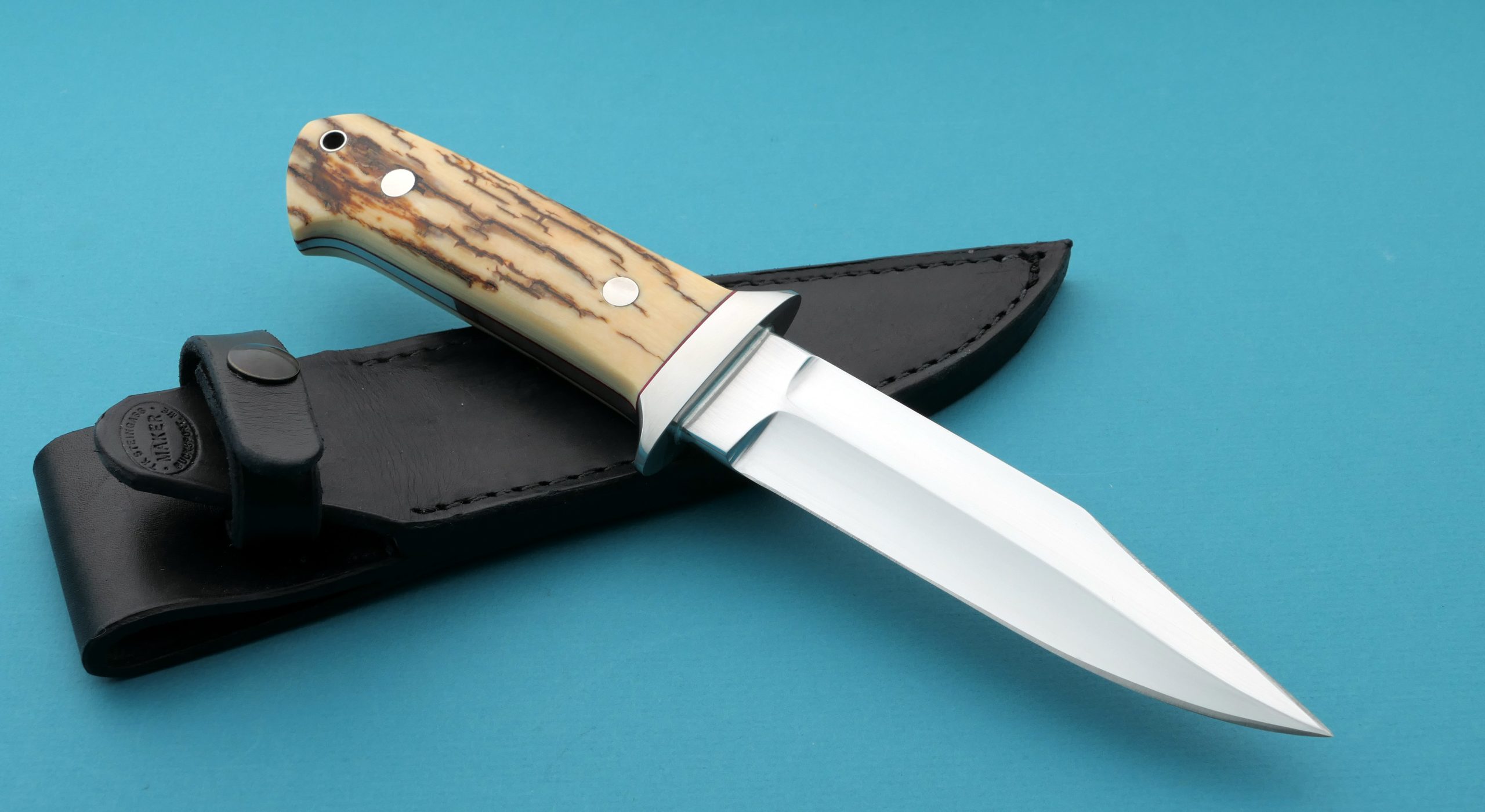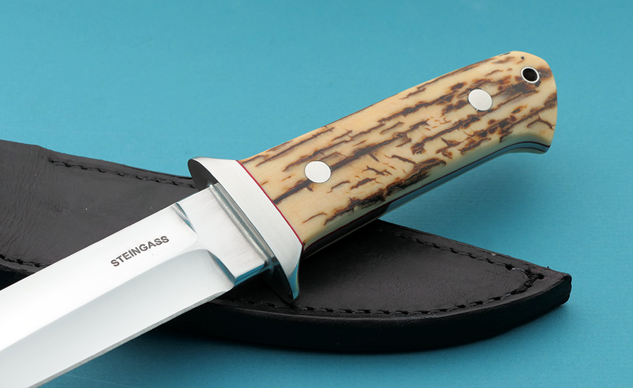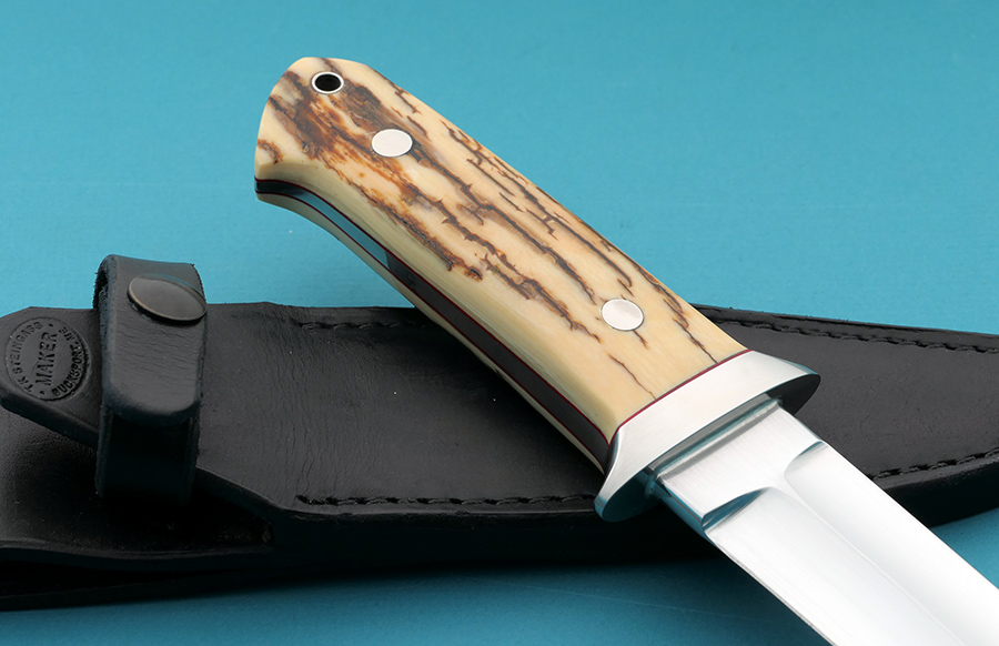 Comments: Excellent balance and handle ergonomics—full tapered tang with red liners and stainless steel lined thong hole. Tim’s take on the classic fighter design.